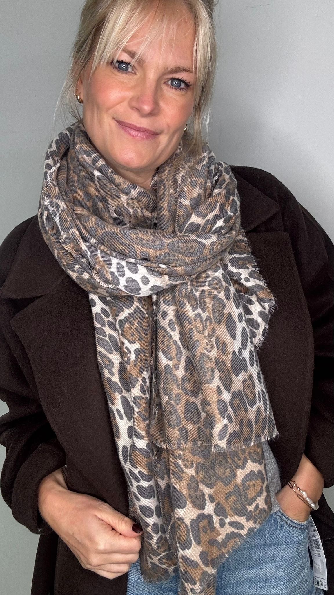 Person wearing a leopard print scarf and blue jeans on a plain background