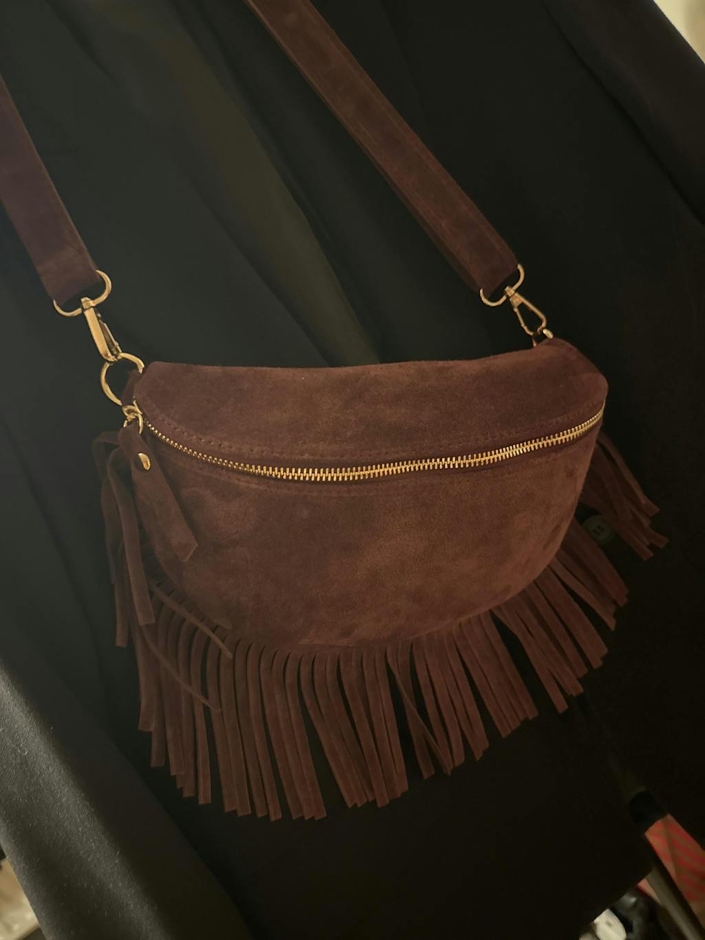 A gorgeous larger burgundy suede leather fringed across body bag with an adjustable self colour suede leather detachable strap. The strap can be worn across your body or around your waist. Perfect for carrying all your essentials in style!