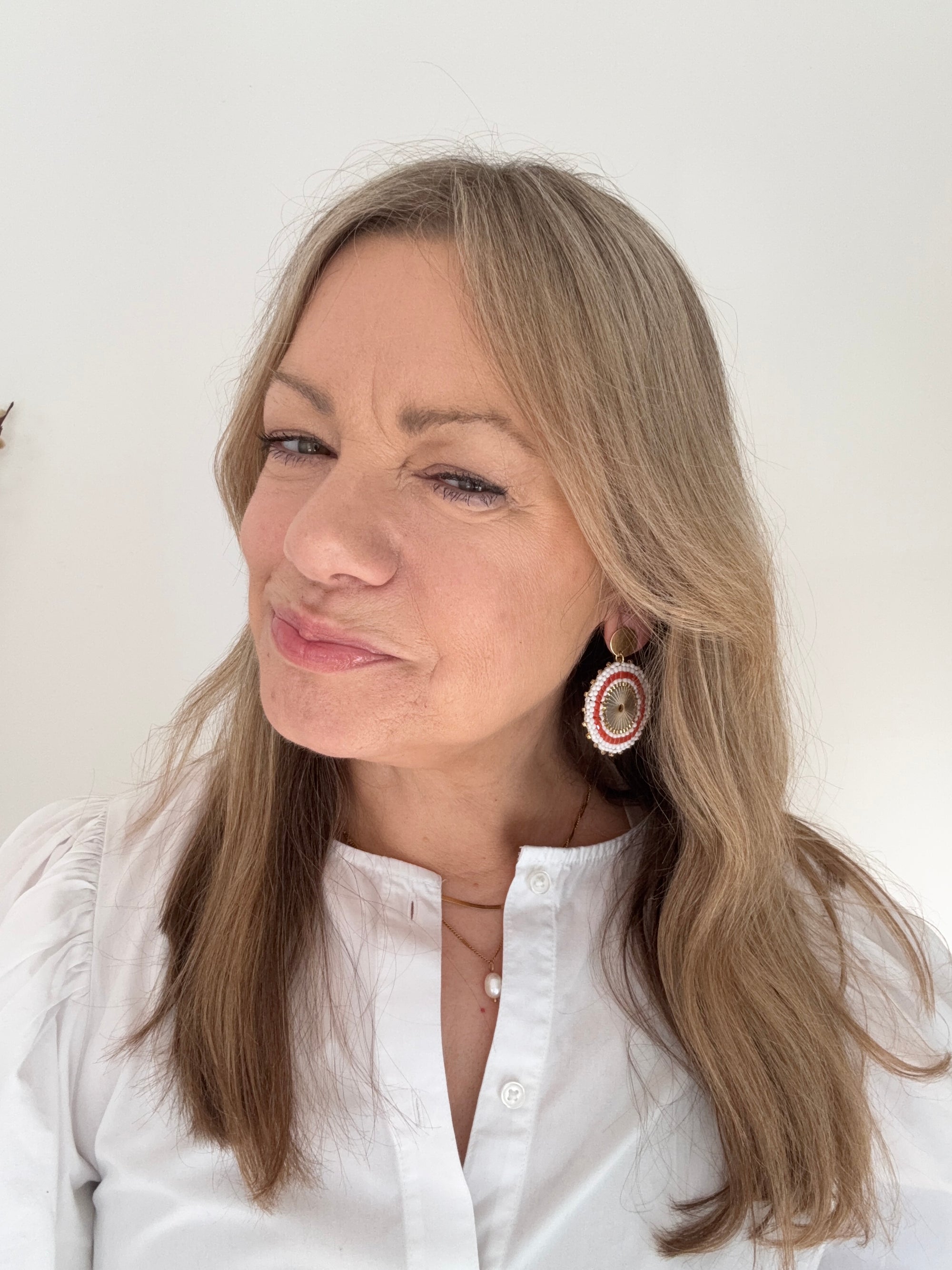 White, Pink & Gold Beaded Disc Earrings